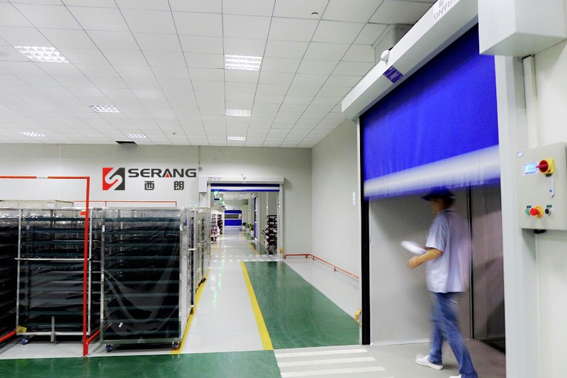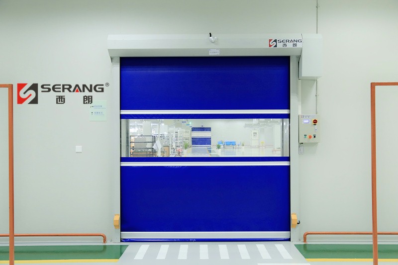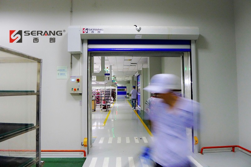 下图:高洁净区配合洁净室、风淋室使用的西朗工业快速门,标准化生产车间每一个出入口都应配备西朗工业快速门。