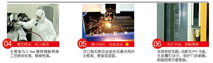 镀锌钢板外部静电喷塑;1.2mm厚;可选配铝合金或不锈钢;双排毛刷密封;订制颜色。 |
