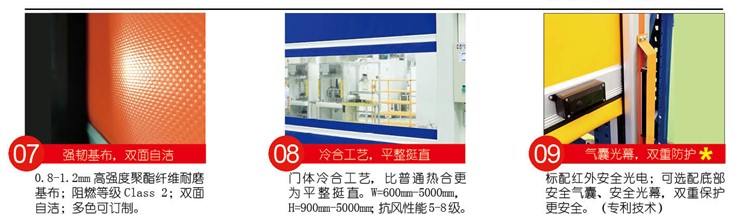 A系列快速门是第五代新型快速门,采用国际领先技术标准的Abundant III集成式高智能控制系统,创新的可视化人机界面设计,实现人机实时交流,中英文显示对话界面服务内外资企业使用。独创将工业美学概念引入框架结构设计中,结合激光构件精密制造,体现结构设计顶级水准。确保常年无故障运行15万次以上,日均1000次左右。