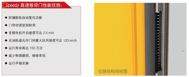 Speedy高速卷帘门的帘布由密度为700-1700 G/m² 的耐用聚酯纤维构成,可内嵌透明帘布作为视窗。此高速门独特的导轨拉链式设计和一体式密封门体,可以在最大限度减少能耗损失的前提下,提供高效的物流出入口,保持室内原有的温度条件和洁净度。